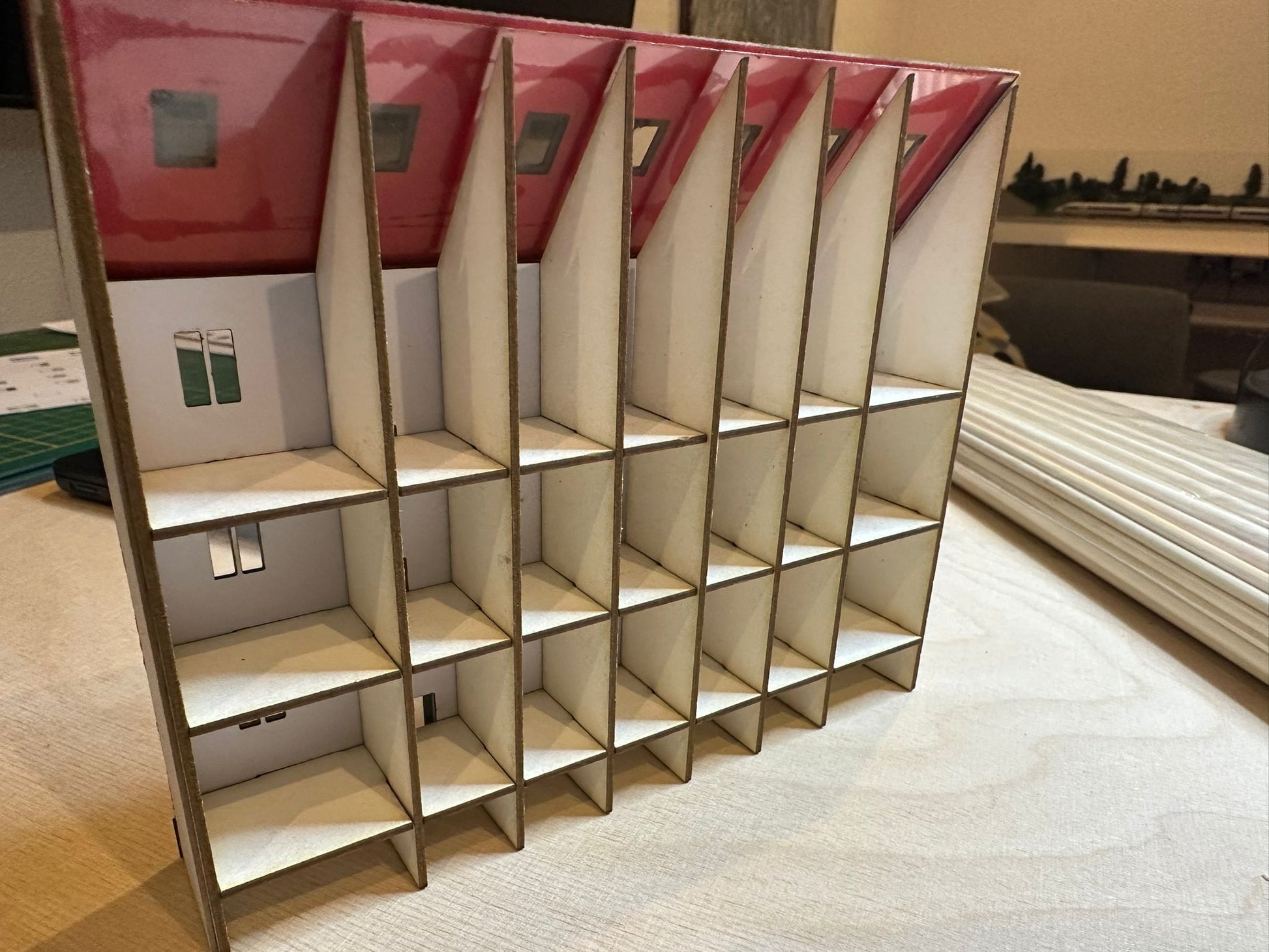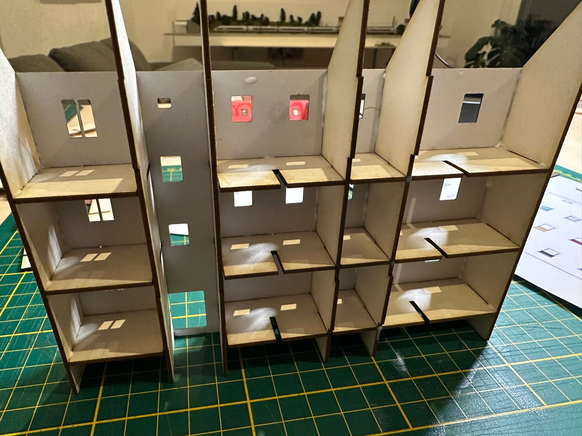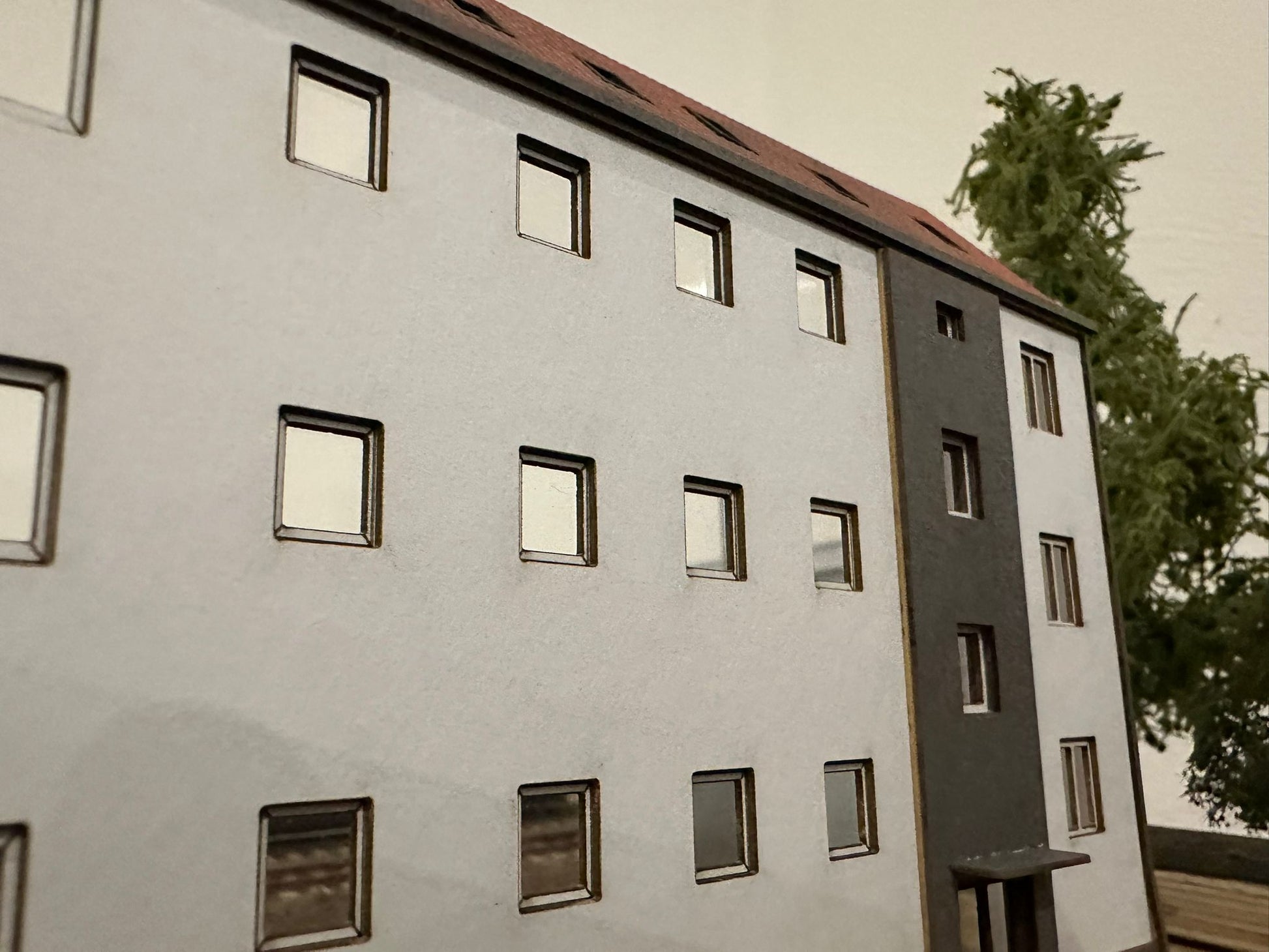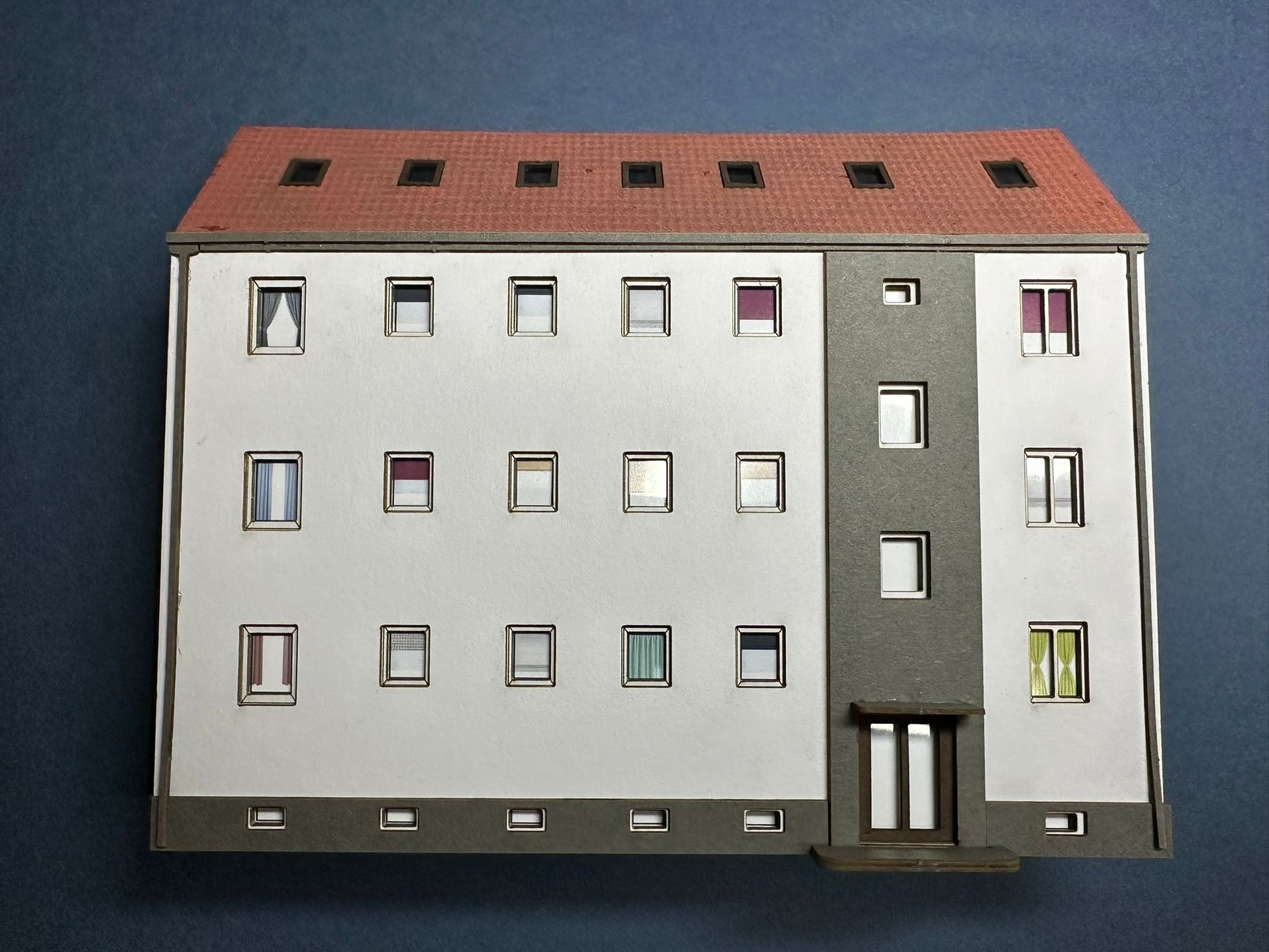 Mehrfamilienhaus als Reliefgebäude Lasercut Bausatz Spur H0 1zu87. Das Gebäude kommt als Bausatz mit transparenten Vorhängen und Mehrfachschlitzungen für den einfachen Einbau von Beleuchtung und Trennwänden. Der Bausatz ist in Kooperation mit BIMM Modellbau entstanden. Er ist für Modellbauer ab ca. 12 Jahren geeignet.