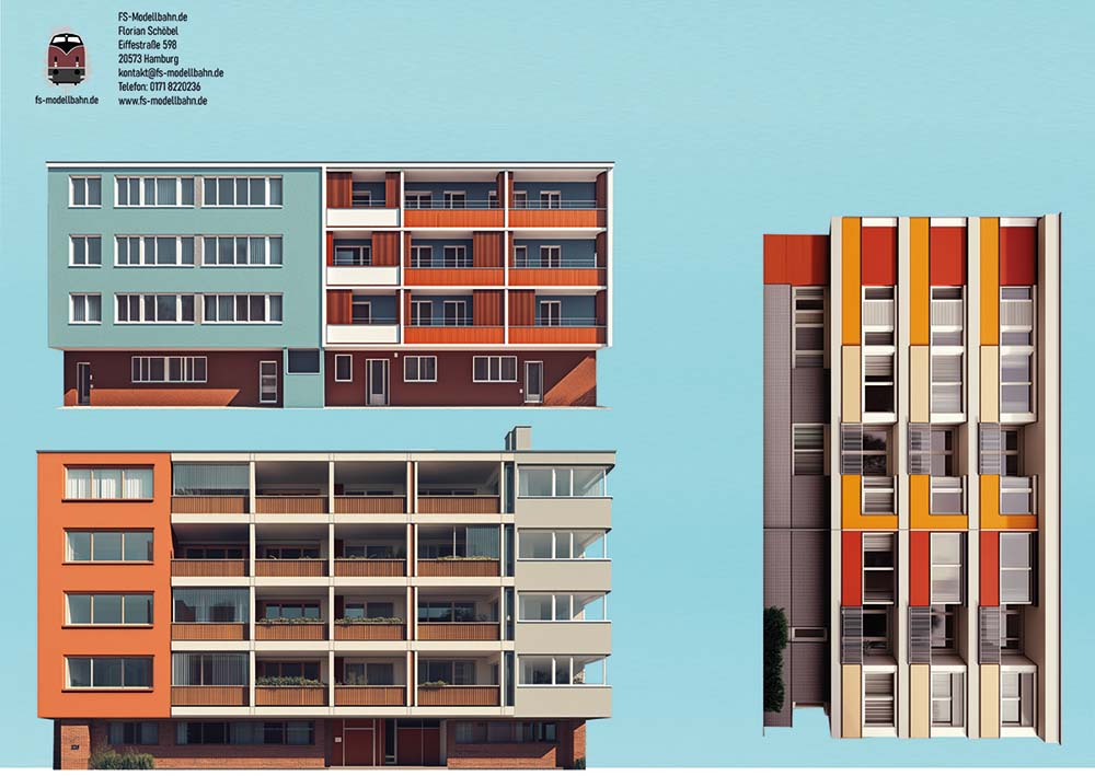 Modellbahnhintergrund 60er Jahre 3 Mehrfamilienhäuser als Set für Spur N 1zu160. Die Gebäude kommen auf einem Din a4 Bögen professionell gedruckt auf 250g/m² Papier. Das entspricht in etwa einer Postkartenstärke. Es lässt sich also sehr gut zuschneiden und ist dennoch sehr stabil. Dieser Modellbahnhintergrund lässt sich mit allen anderen Gebäudehintergründen aus meiner Reihe kombinieren. Die Gebäude sind zum Ausschneiden gedacht.