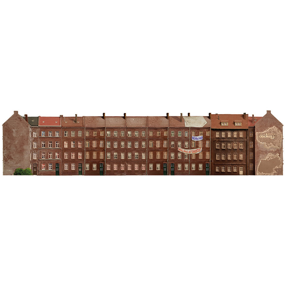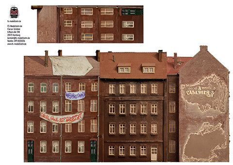 Modellbahnkulisse in Spur TT in 1 zu 120 in ca. 65cm Breite. Der Hintergrund ist kombinierbar mit anderen Spur TT Kulissen. Das Besondere an diesem Hintergrund ist, dass eine Hausbesetzung gezeigt wird. Hinterhofgebäude in einer Reihe. Die Gebäudezeile kommt auf zwei Din a4 Bögen hochwertig gedruckt auf 250g/m² Karton zum Ausschneiden.