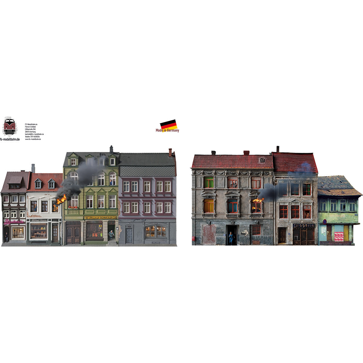 Modellbahnhintergrund brennendes Gebäude Actionkulisse Motiv 1 und 2 im Set mit je drei unterschiedlichen Gebäuden von denen eins zu brennen beginnt für eine Stadt für Spur H0 1zu87. Die Gebäude kommen auf zwei Din a4 Bögen professionell gedruckt auf 250g/m² Papier. Das entspricht in etwa einer Postkartenstärke. Es lässt sich also sehr gut zuschneiden und ist dennoch sehr stabil. Dieser Modellbahnhintergrund lässt sich mit allen anderen Gebäudehintergründen aus meiner Reihe kombinieren. Die Gebäude sind zum Ausschneiden gedacht.