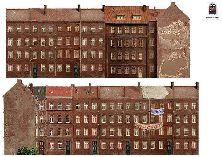 Modellbahnhintergrund mit Hausbesetzung in Spur N in 1 zu 160 in 51cm Breite Hinterhofgebäude | FS-Modellbahn
