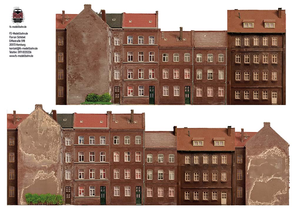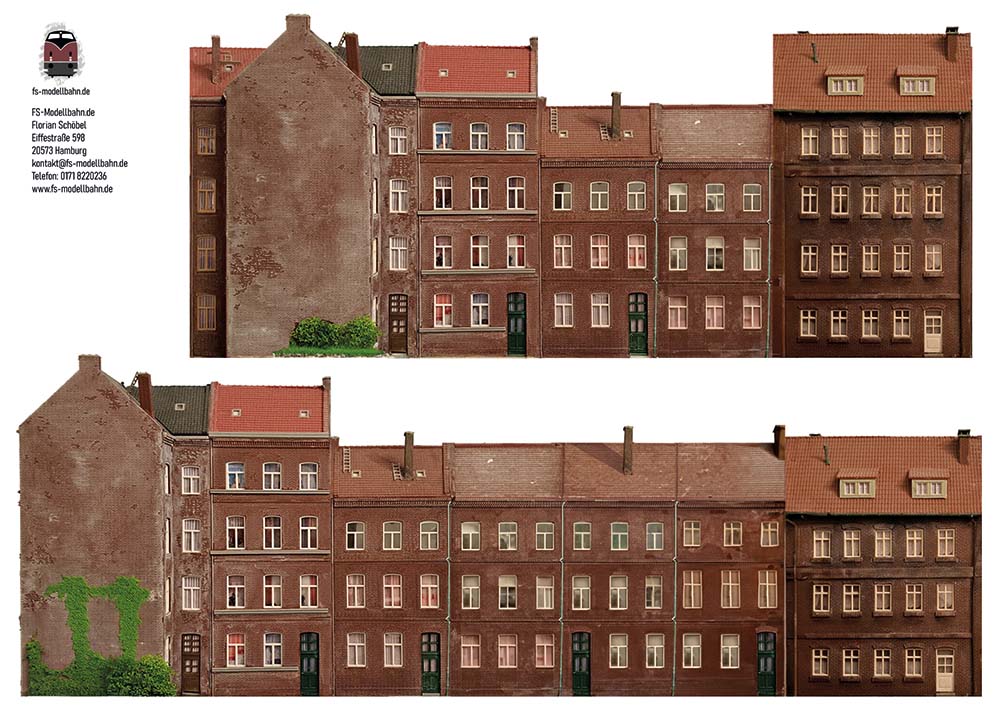 Modellbahnhintergrund mit Hinterhofgebäude verschiedenen Dachhöhen in Spur N in 1 zu 160 in 104 cm Breite | FS-Modellbahn