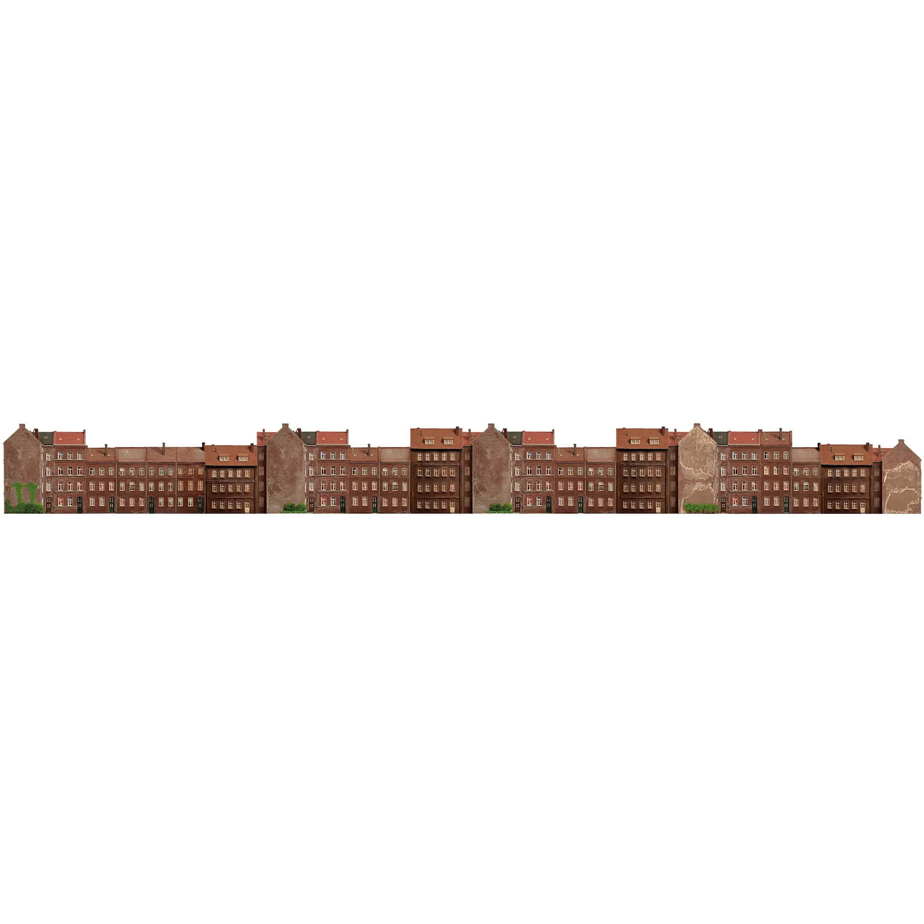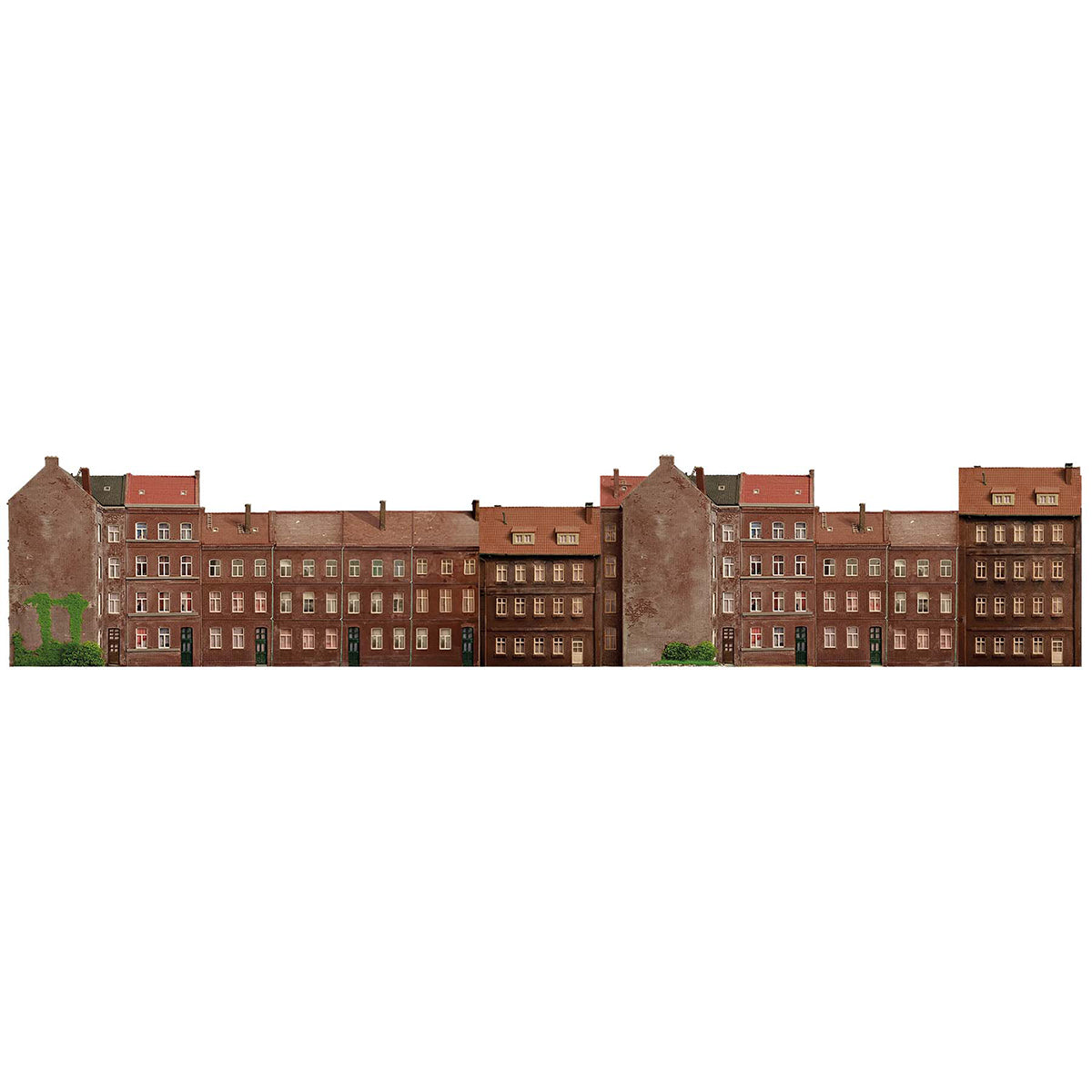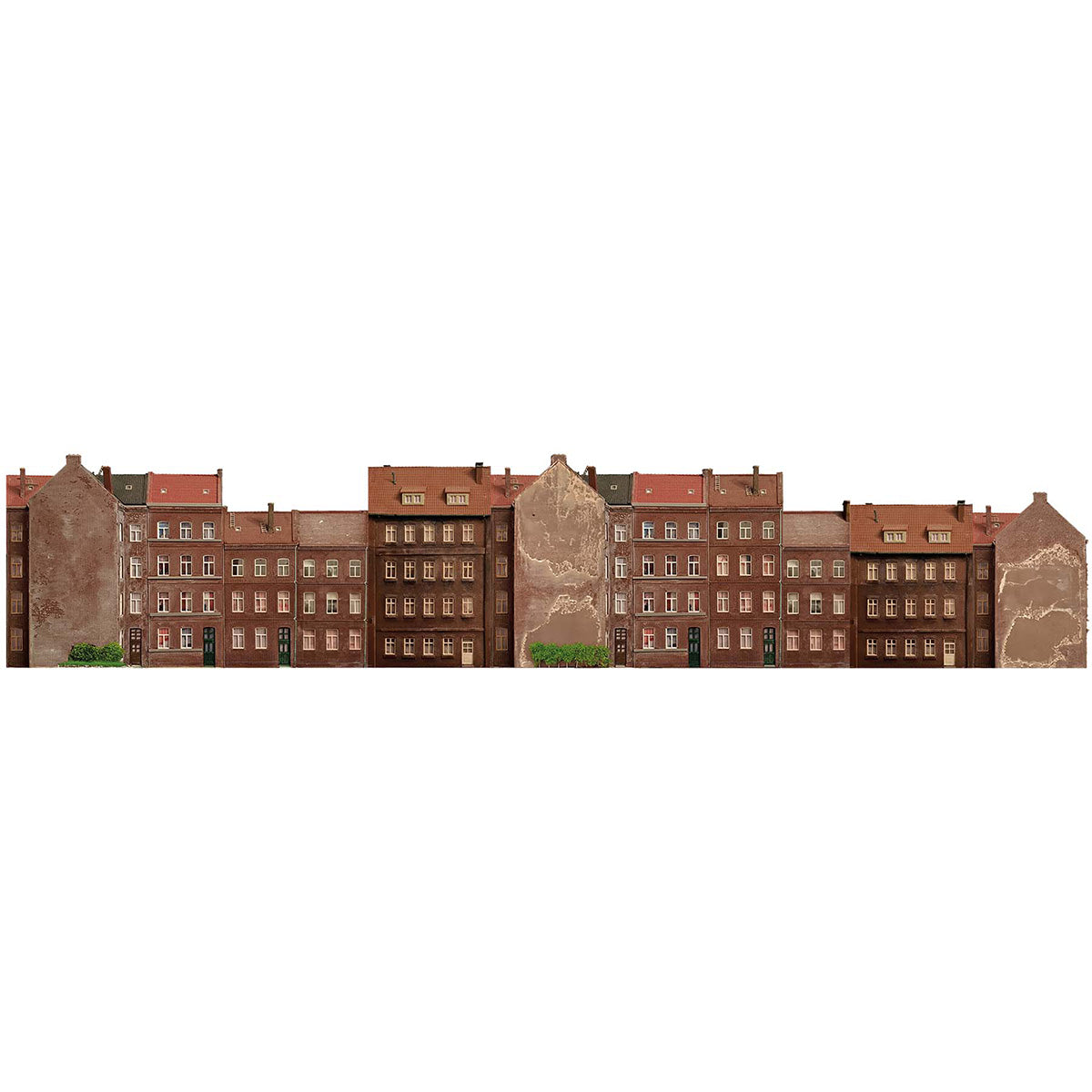 Modellbahnkulisse in Spur N in ca. 1 zu 170 (gedacht für die Kombination mit Vollmergebäuden und eher klein ausfallenden Modellhäusern.) Der Hintergrund ist ca. 104cm breit und gut 9,3cm hoch am höchsten Schornstein sind es 10,2cm. Der Hintergrund ist kombinierbar mit anderen Spur N Kulissen. Hinterhofgebäude mit Hausbesetzung in einer Reihe. Die Gebäudezeile kommt auf zwei Din a4 Bögen hochwertig gedruckt auf 250g/m² Karton zum Ausschneiden.