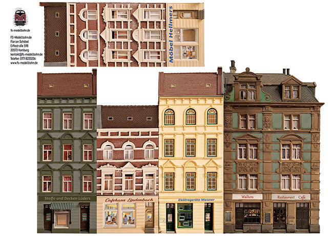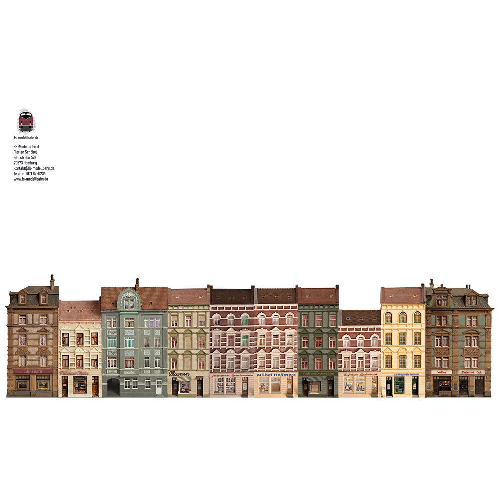 Modellbahnhintergrund Set Gründerzeitaltbauten 62cm Breite mit Ladengeschäften zum Kombinieren Spur TT in 1 zu 120 | FS-Modellbahn