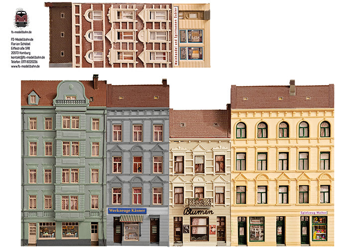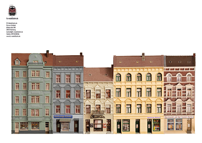 Modellbahnhintergrund Gründerzeitaltbauten 32cm Breite mit Ladengeschäften zum Kombinieren Spur TT in 1 zu 120 | FS-Modellbahn